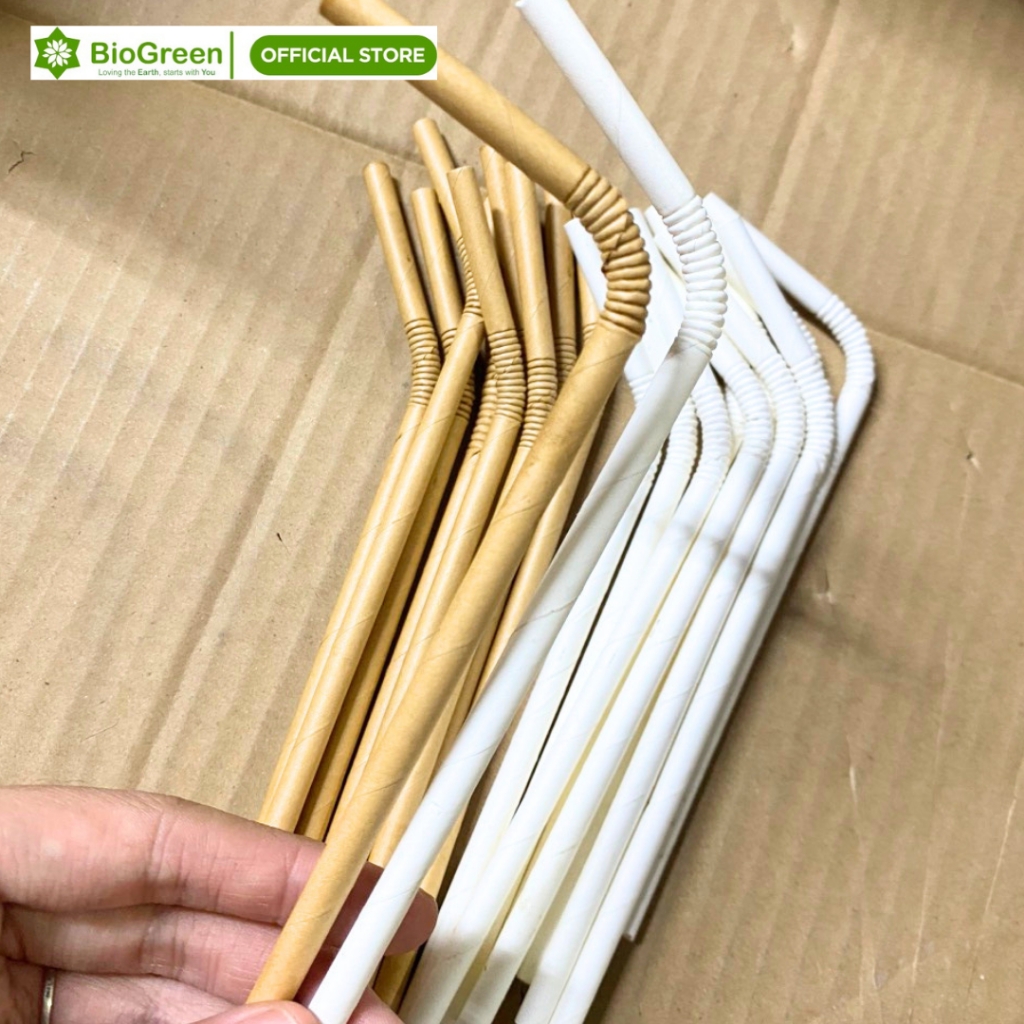 1000 ống hút giấy cong Biogreen màu trắng, kraft dùng uống cafe, sinh tố